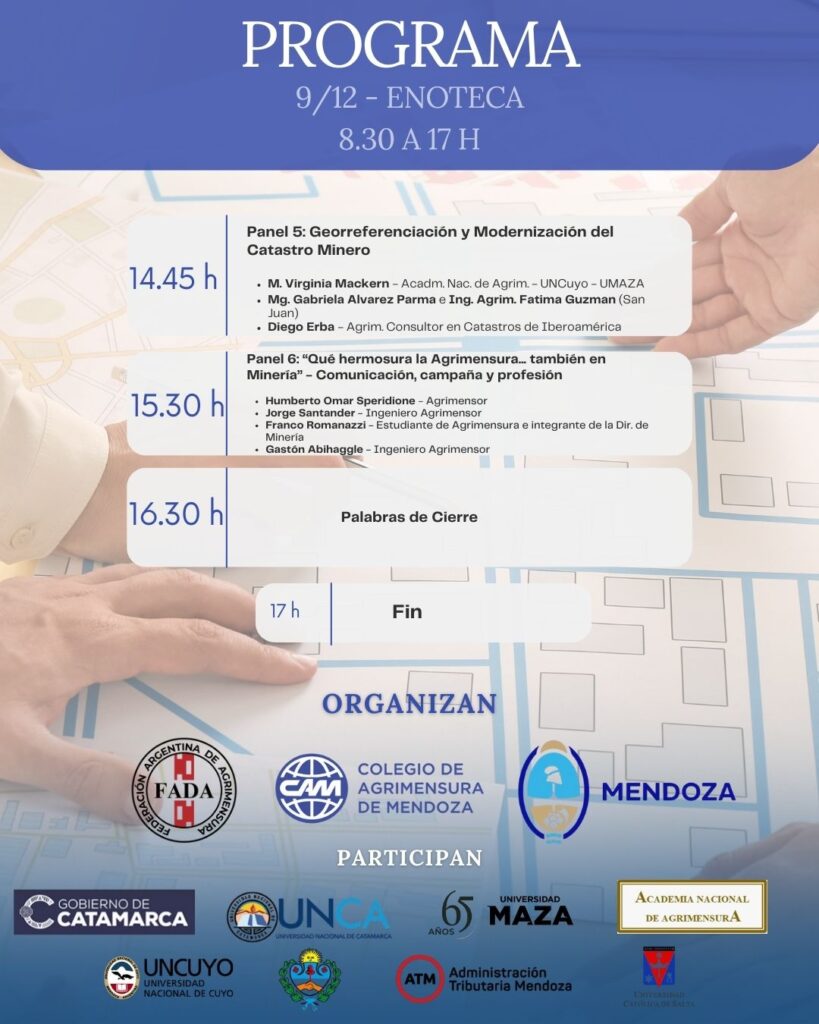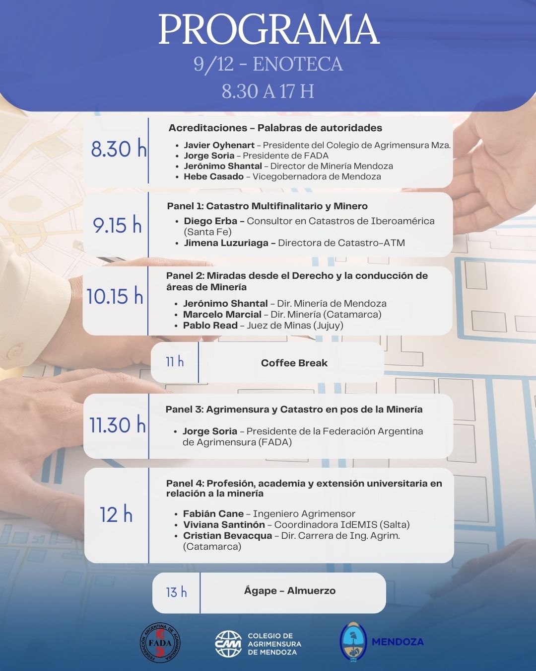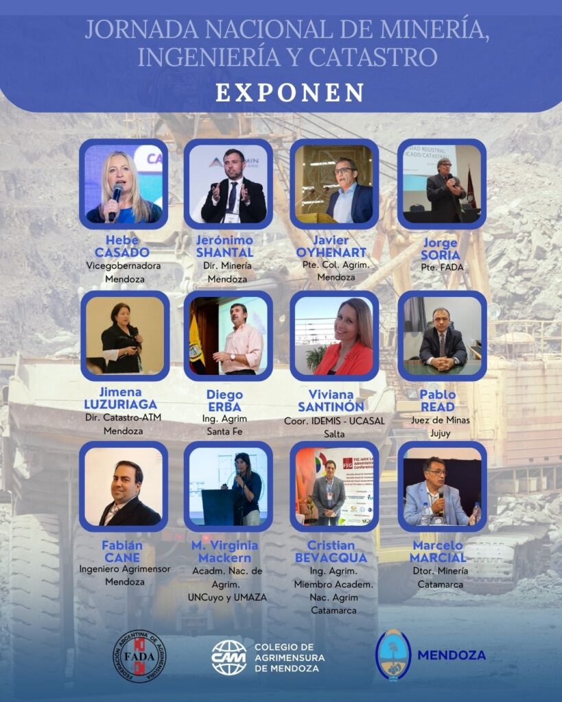 La Jornada es organizada por el Colegio de Agrimensura de Mendoza, el Gobierno de Mendoza y la Federación Argentina de Agrimensores (FADA), con la participación de entidades académicas y organismos provinciales que integran el ecosistema técnico-profesional de la agrimensura y la minería.